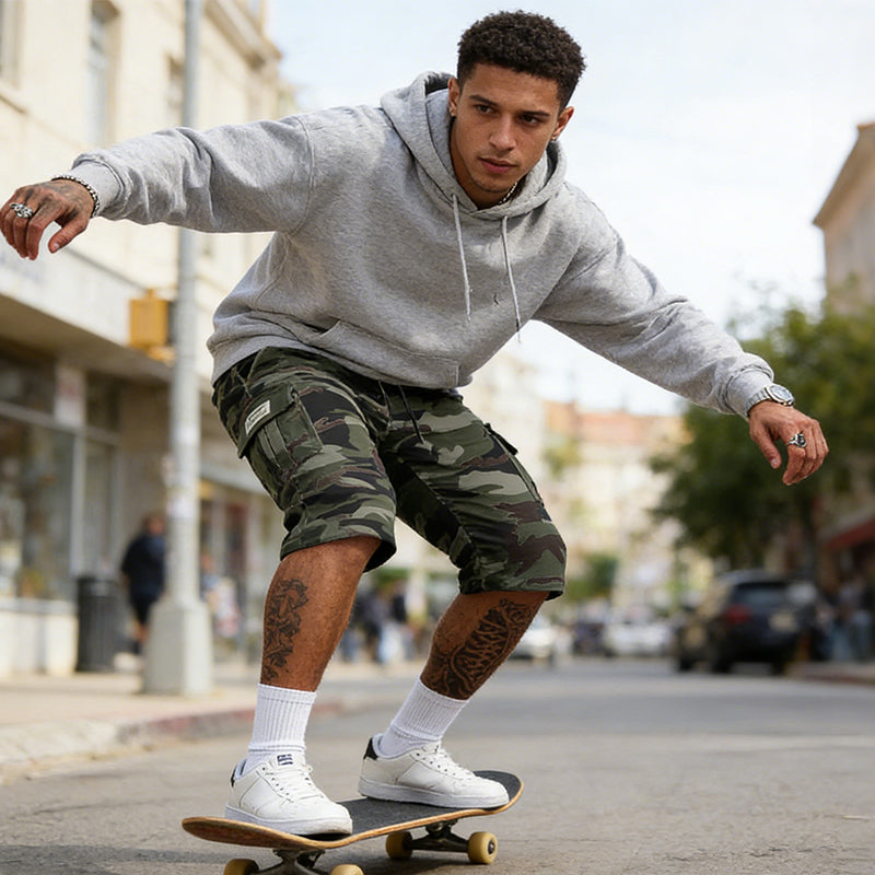 Pantaloni scurți cargo pentru bărbați, cu imprimeu camuflaj și multiple buzunare