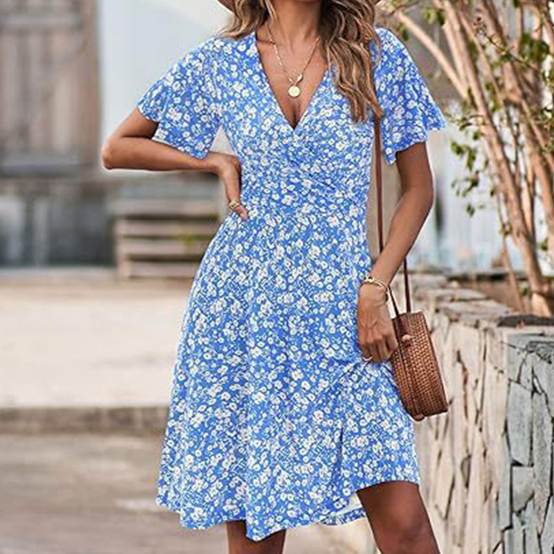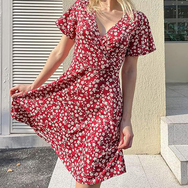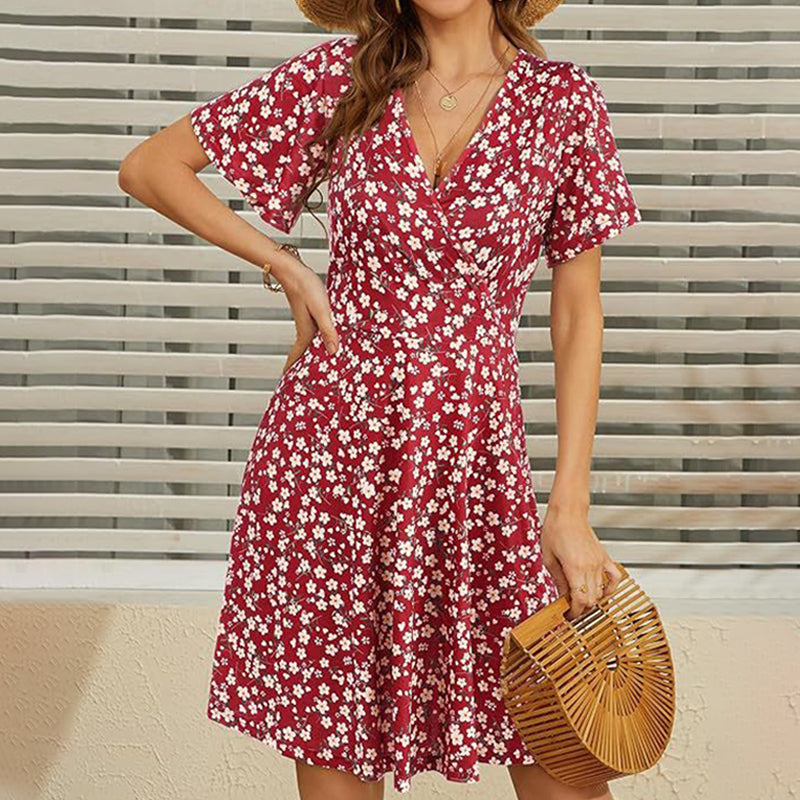 Rochie elegantă pentru femei, cu imprimeu floral, decolteu în V și mâneci scurte